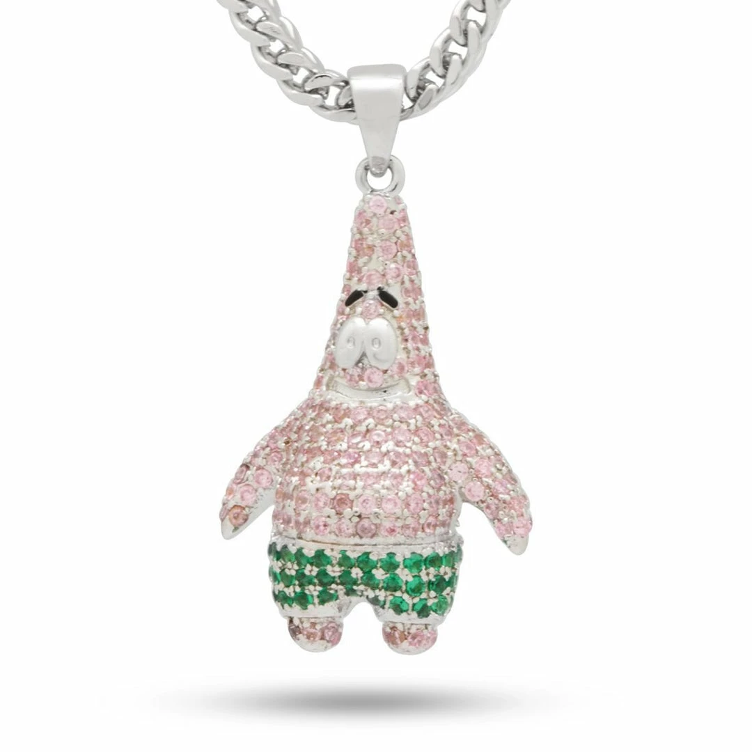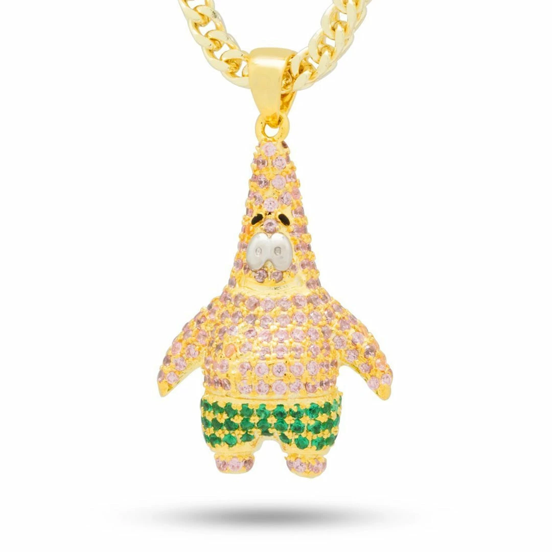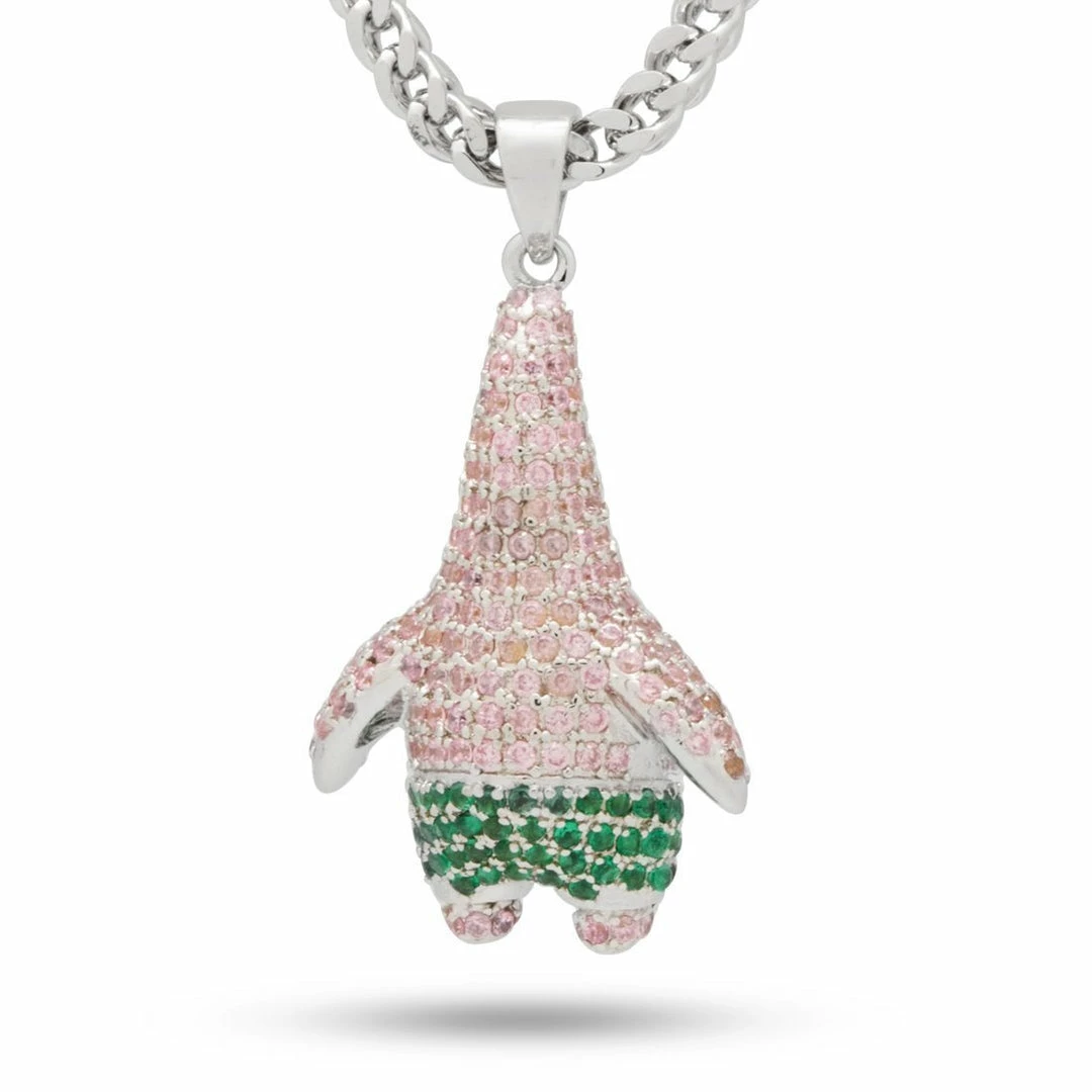 This Patrick Star necklace is 3D designed with VVS Diamond Simulate stones and 14K Gold ionic plating and white gold plating. Each pendant is paired with a 2.5mm, 20″ Stainless Steel Franco Chain.
