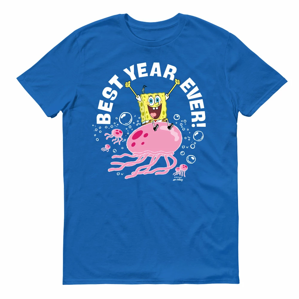Jumpin’ jellyfish! It’s the BEST. DAY. EVER! Celebrate 20 years of side-splitting laughs, sea tales, and nautical nonsense with the exclusive SpongeBob SquarePants Best Year Ever Jellyfish Short Sleeve T-Shirt. Featuring the jellyfishing expert himself on the front and the official 20th anniversary logo on the back, this comfy tee comes in two classic color choices, making it a must-have for your wardrobe!