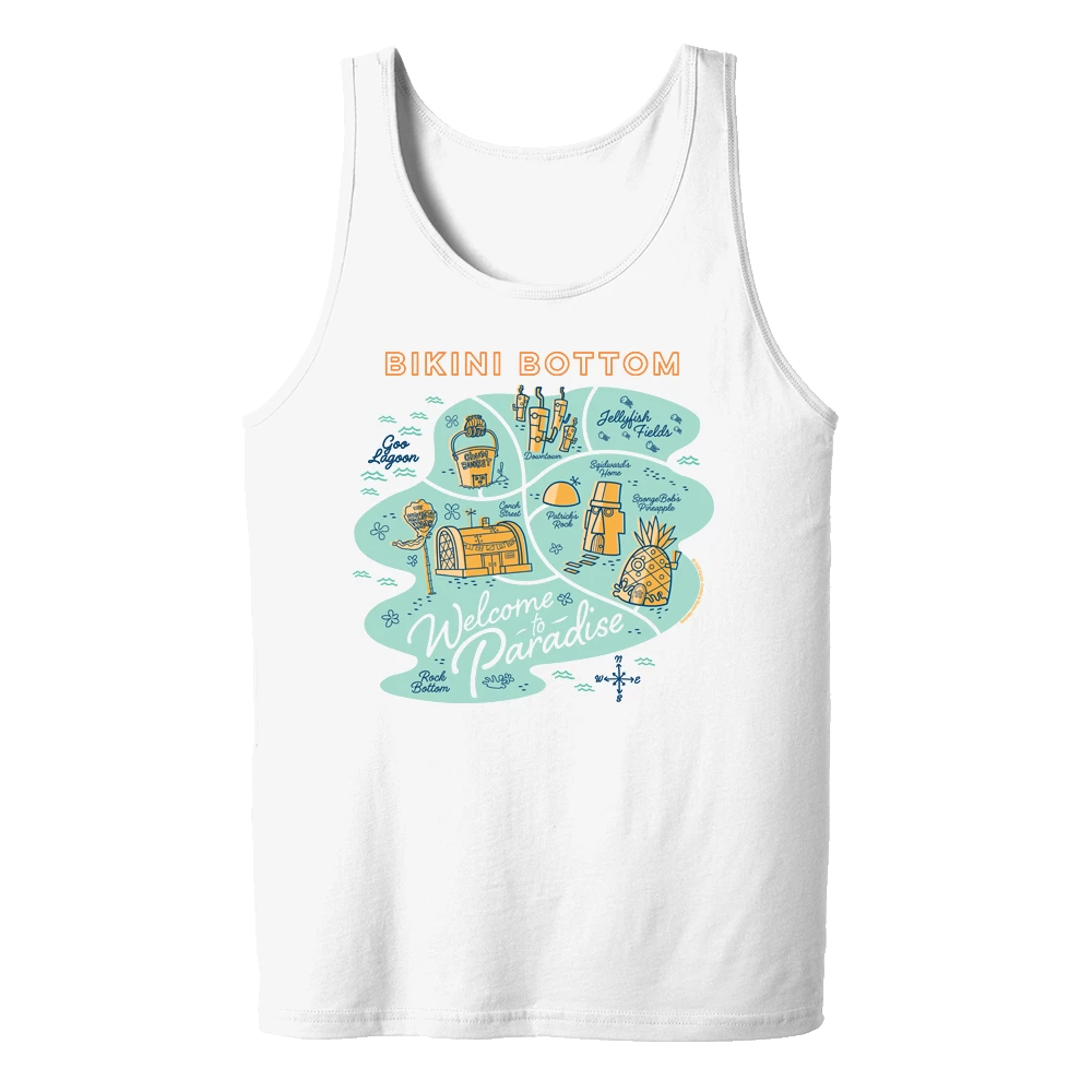 Ever wish you could take Bikini Bottom with you everywhere you go? Now you can! Featuring all of your favorite Bikini Bottom places and spaces, this SpongeBob SquarePants Welcome to Paradise Unisex Tank Top lets you represent your favorite city on both land and sea.