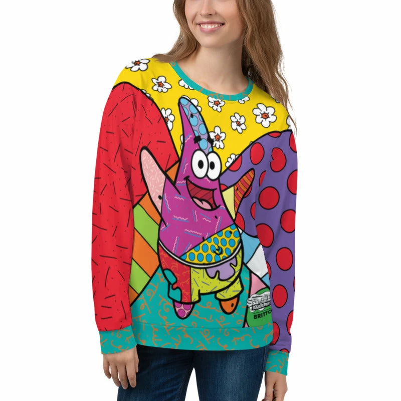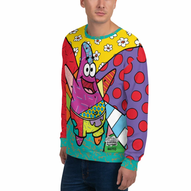 Telling the tales of the Ugly Barnacle or studying Wumbology — whatever you do, you will look cooler than a sea cucumber when wearing this Patrick Britto Crew Neck Sweatshirt! This comfy crew neck combines the brilliant designs of pop artist Romero Britto with Bikini Bottom’s favorite sea star to create the most stylish sweatshirt in the deep blue sea.