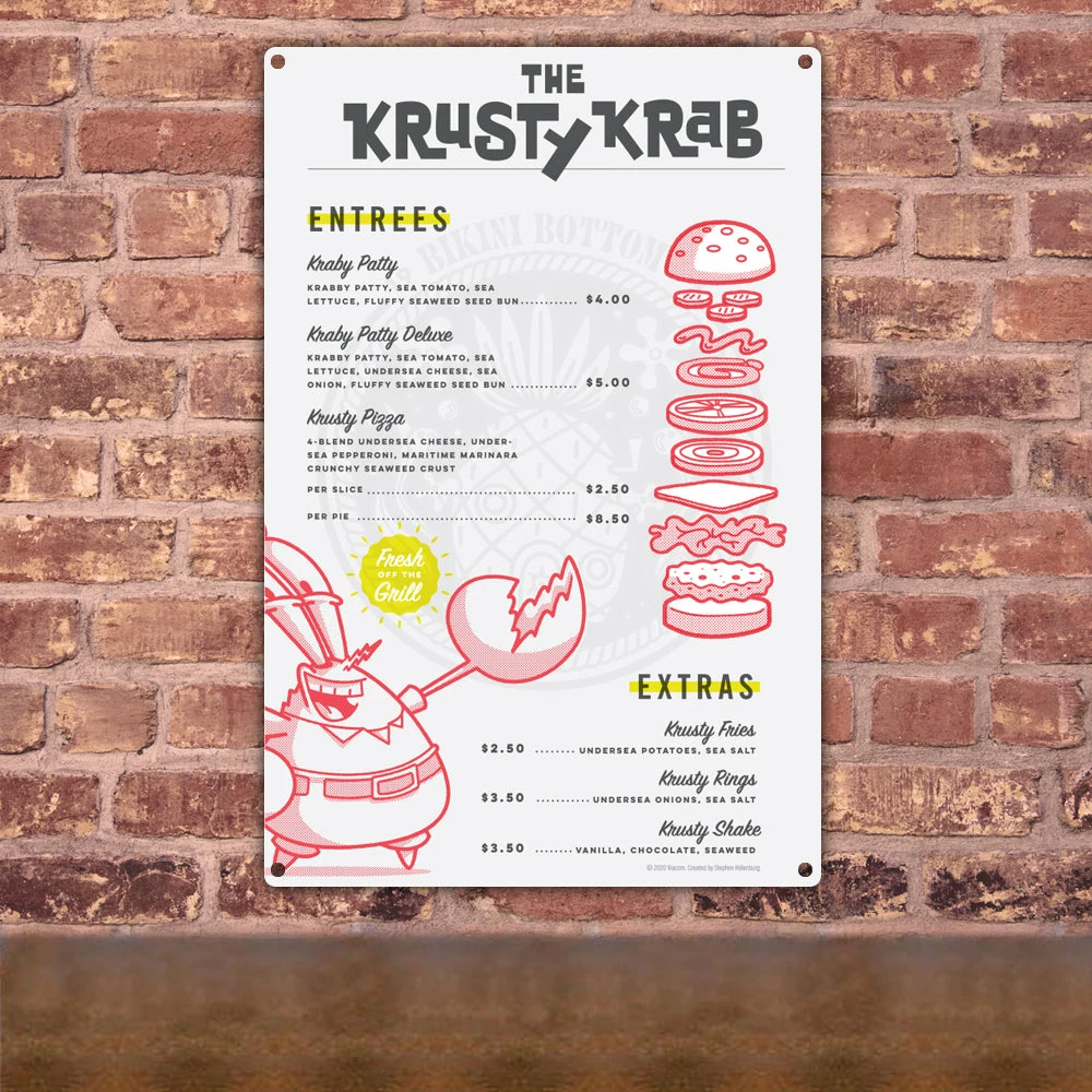 Jumpin’ jellyfish! This The Krusty Krab Menu Metal Sign is the perfect addition to your pineapple home’s kitchen. Featuring Mr. Krabs pointing his claw to the Krusty Krab menu, this metal sign is a F.U.N. addition to homes on land and under the deep blue sea!